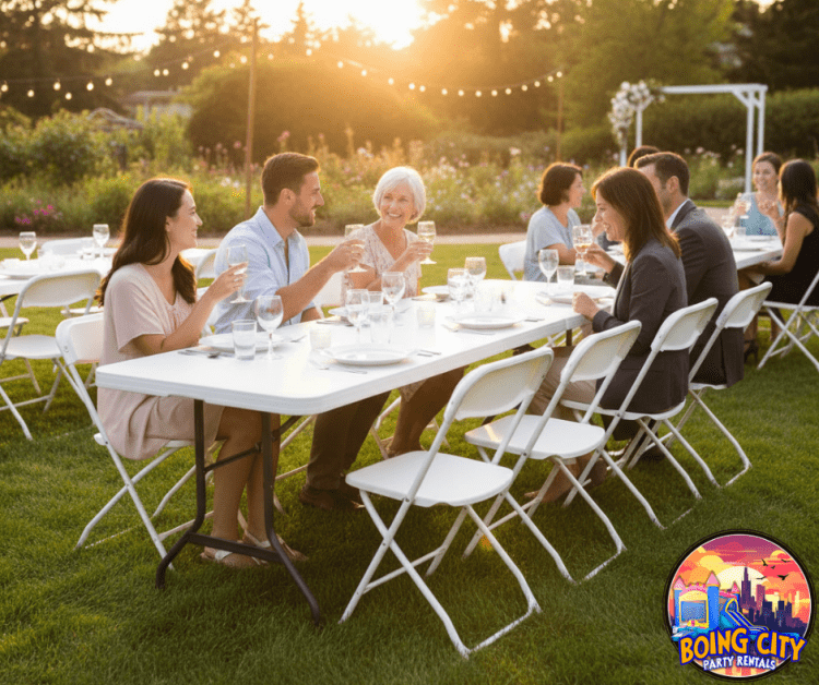 Transform your party space with our 6-foot folding tables and chairs for rent! Elevate the atmosphere as you gather friends and family around these versatile tables, providing both style and convenience. Whether it's a cozy family celebration or a lively get-together with friends, our folding tables and chairs are the perfect companions to ensure everyone has a seat at the fun-filled feast of memories. Cheers to hassle-free setup and a party that unfolds effortlessly!