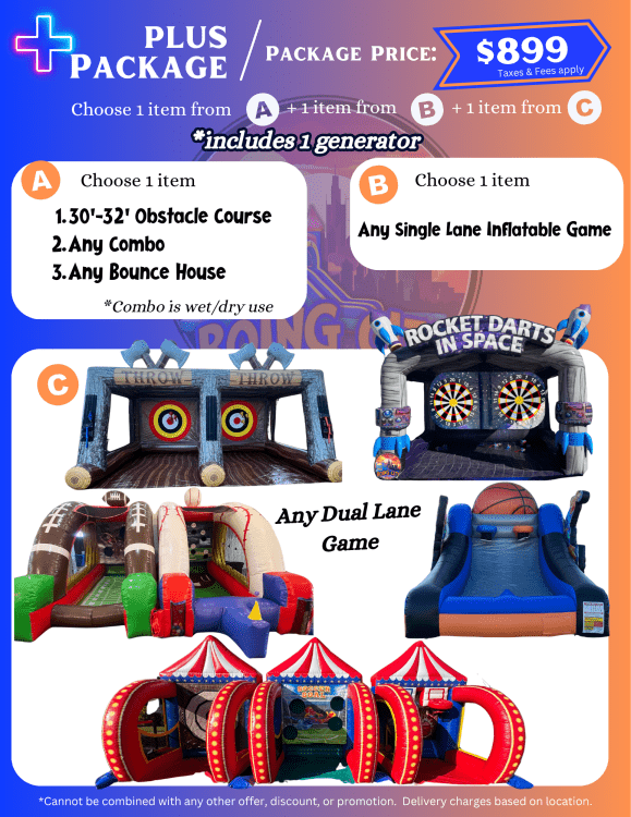 The Plus Package gives you the flexibility to build the perfect event setup! Choose 1 item from Category A, 1 from Category B, and 1 from Category C to create a customized experience that fits your party’s needs. Whether you're looking for inflatables, games, or interactive attractions, this package is great for birthdays, school events, and celebrations of all kinds. Book the Plus Package today and create your ideal party lineup! 🎉🔥