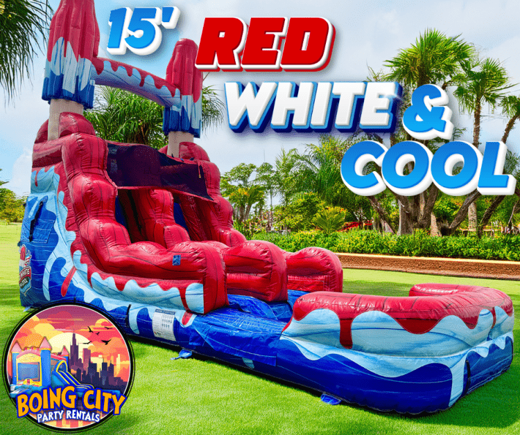 The 15' Red, White & Cool waterslide is the ultimate all-American thrill ride! Standing tall with bold red, white, and blue colors. Riders will feel the rush as they zoom down and splash into the pool below, making it perfect for Fourth of July parties, summer celebrations, and big events. Book now and bring the coolest patriotic splash to your next event!💦🎉